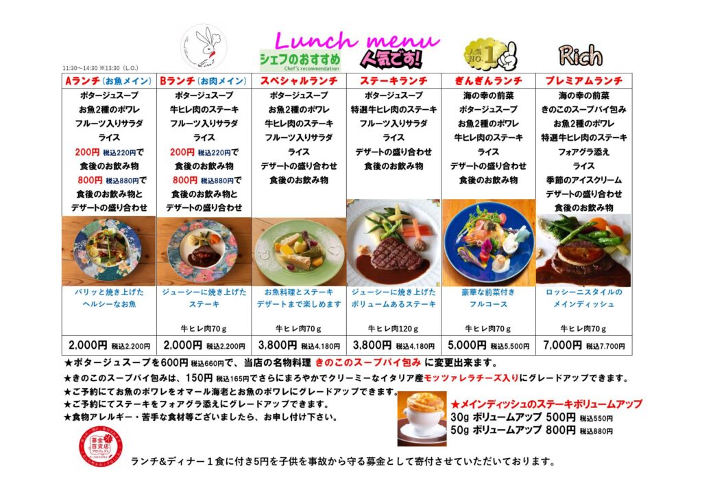 • ランチ&ディナー1食に付き5円を子供を事故から守る募金として寄付させていただいております。