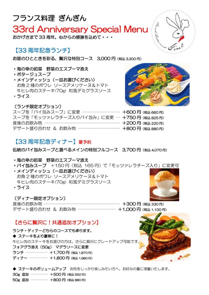 • メインディッシュのステーキボリュームアップ:30g +550円(税込)、50g +880円(税込)